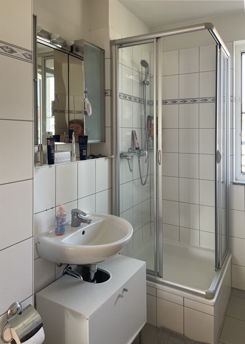 Die früher übliche hohe Duschtasse von 80 x 80 Zentimetern wurde entfernt. Stattdessen ließen wir ein Modell von 90 x 140 Zentimetern einbauen, das über die ganze Raumbreite geht. Eine bodenebene Ausführung war – wie so häufig im Bestand – nicht möglich, da der Anschluss an das Fallrohr zu hoch lag. Auf unsere Empfehlung hin entschied sich die Kundin für eine flache Duschtasse aus Stahlemaille. Dieses Material ist leicht zu reinigen, robust, langlebig und die durchgehende Fläche garantiert Dichtigkeit. Dazu kommt eine Garantie von 30 Jahren! Die rutschhemmende Oberfläche in R10B sorgt für Sicherheit beim Duschen. Um die nötige Einbauhöhe zu erreichen, liegt die Duschtasse auf einem niedrigen gefliesten Podest auf. Als Duschabtrennung dient ein Festglaselement. Die Scheibe ist in eine Schiene eingeschoben, die in die Fliesen eingelassen ist. Eine filigrane Stabilisationsstange sorgt für die Standfestigkeit. Auf eine Tür wurde bewusst verzichtet, denn die Kundin sagt: „Alles, was sich bewegt, kann kaputtgehen!“ Daher entschied sie sich auch für eine Aufputz-Armatur, die sich bei einem Defekt einfach austauschen lässt. Die Kombination der Thermostatarmatur mit Kopfbrause und höhenverstellbarer Handbrause bietet trotzdem komfortables Duschvergnügen. Als Ablagefläche dient die Fensterbank, eine Shampoonische war daher nicht nötig.
