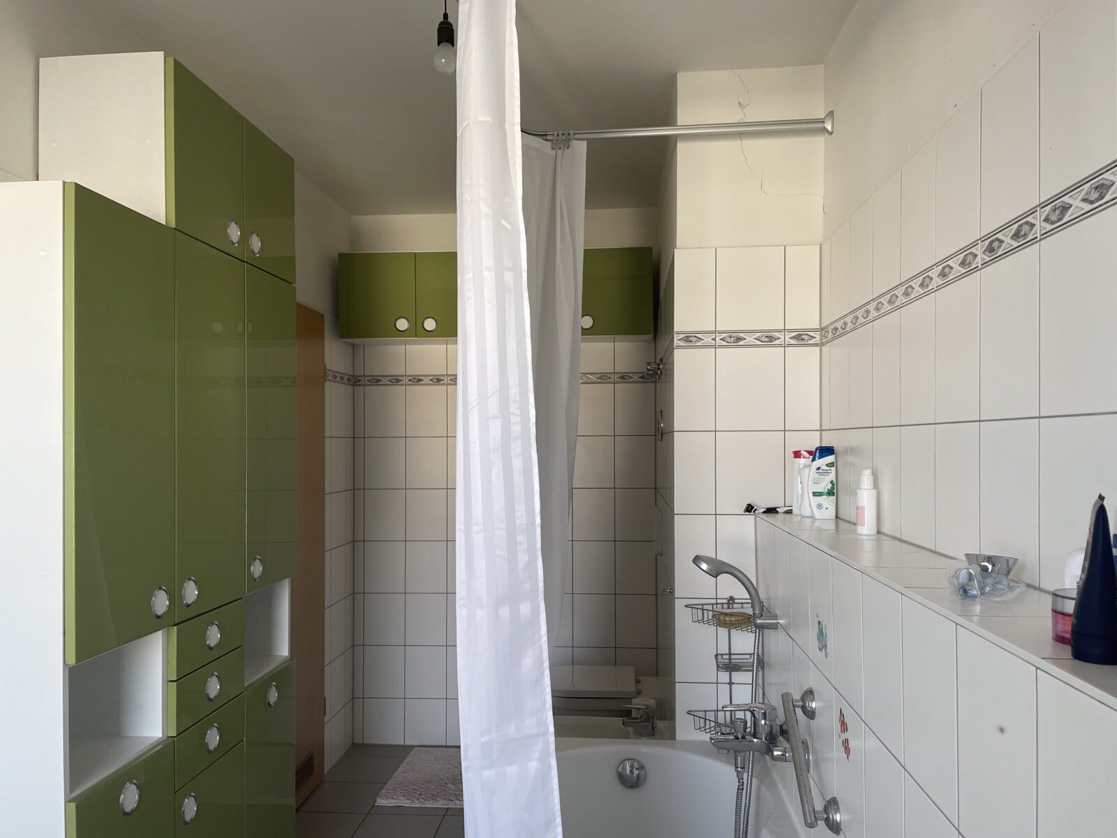 Um den Mietern alle Optionen zu bieten, entschied sich die Kundin für den Einbau einer Wanne. Dank der großen Bodenfläche kann in ihr auch bequem geduscht werden. Als Wanne wählten wir ein Modell mit einer abgerundeten Ecke, ebenfalls aus Stahlemaille. Es passt zu den anderen runden Elementen im Raum und verhindert zugleich schmerzhafte „Begegnungen“. Auch hier ist wieder eine feste Duschabtrennung eingebaut.
